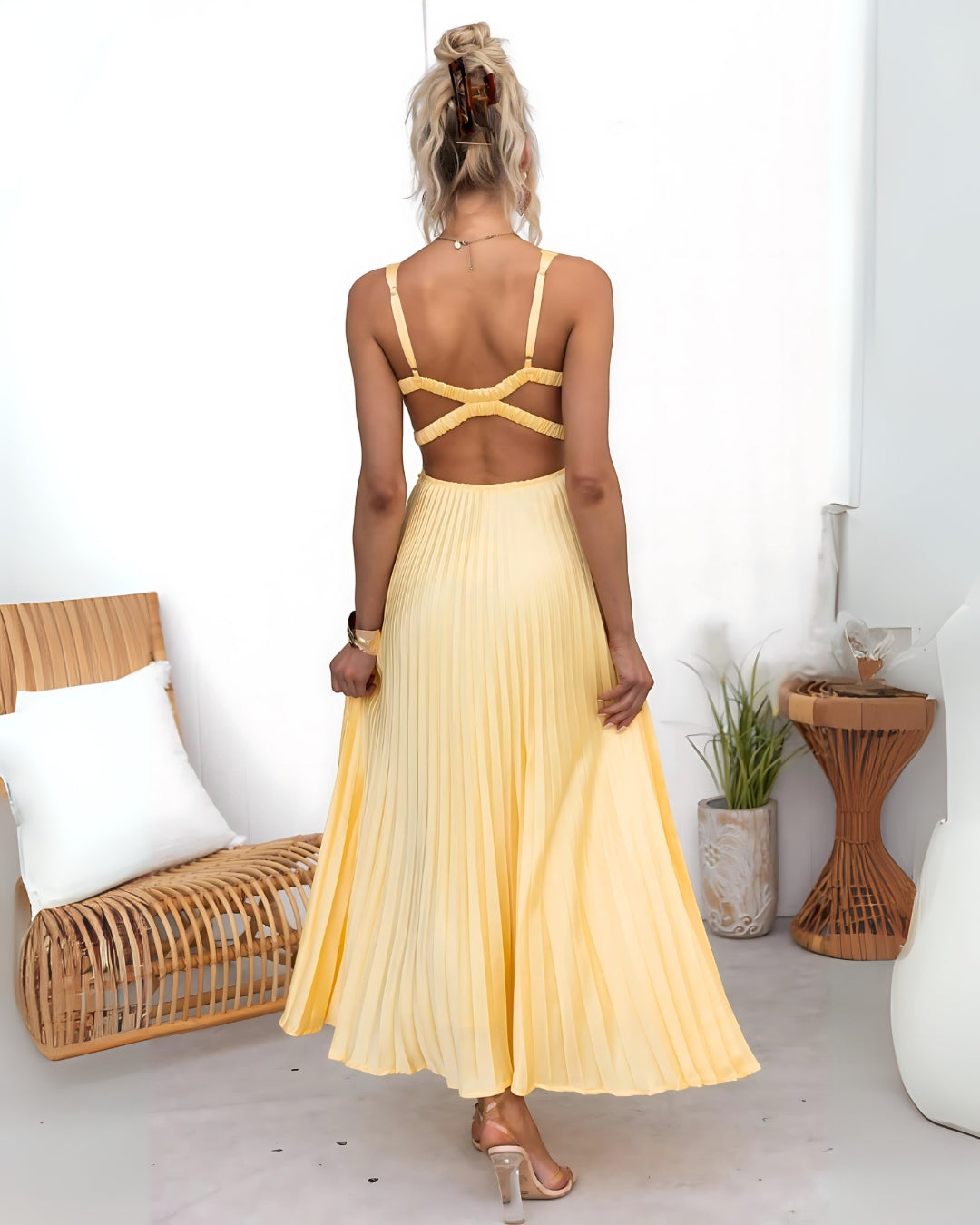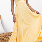 Elly Gelbes Plissiertes V-Ausschnitt Maxikleid